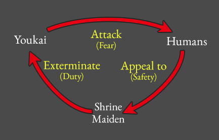 Time for the overview! Touhou Project takes place in a closed-dome called Gensokyo. It's inside of a dome-shaped barrier which is not awfully large. This is the Great Hakurei Barrier, which was created to ensure the delicate balance between humans and youkai stays put. With the modernization of society, folklore and myths become forgotten---Gensokyo is where these forgotten things end up. All kinds of youkai inhabit Gensokyo, but it's not too violent of a place, as its inhabitants (usually) follow the Spellcard Rules. These rules are why 'danmaku', the bullets the player character dodges, are used in battle. Whoever loses in the Spellcard duel obeys the winner. The shrine maiden, Reimu Hakurei, is the main human responsible for keeping Gensokyo's balance. Naughty youkai cause 'incidents', disturbances to this balance, and she 'exterminates' them in return.